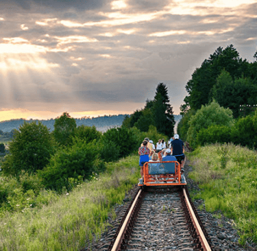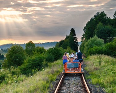 Dreżyny rowerowe w Uhercach Mineralnych — jazda po torach kolejowych wśród pięknych widoków i natury.